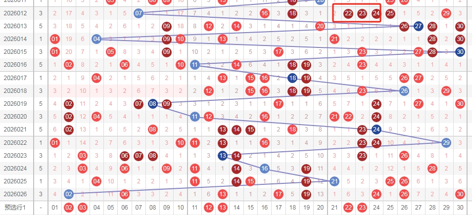 上图是福彩七乐彩开奖号码走势分布图,我在上面走势图中标注出来的数字一共有12个,这12个数字上期只开出了一个数字06,最近两期这个区域也只出现了3个数字,那么本期这个区域的数字大家都可以留意留意出2个或者3个吧。