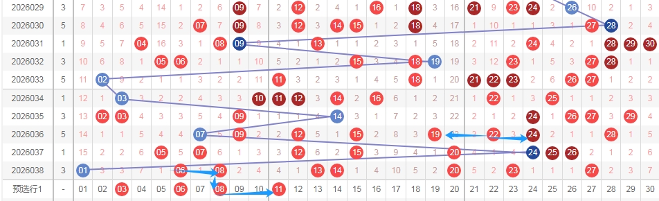 上图是福彩七乐彩开奖号码走势分布图,我标注出来的蓝色小箭头看看表示相似的地方,上面数字19 22 24其中数字22 24是跨度二组合,那么上期开出了跨度二组合0608本期可以考虑一下0306跨度三组合和0811跨度三组合,因为上面跨度二组合2224带了1922跨度三组合。