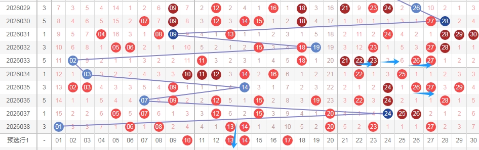 上图是福彩七乐彩开奖号码走势分布图,我标注出来的蓝色小箭头表示相似的地方,上面出现了连号22 23和2627都有带跨度三组合,比如上面2223连号带了数字26,然后下面连号2627带了数字29,2629是跨度三组合,那么上期开出了连号1314,本期可以考虑10 13跨度三组合,或者1417也是跨度三组合。