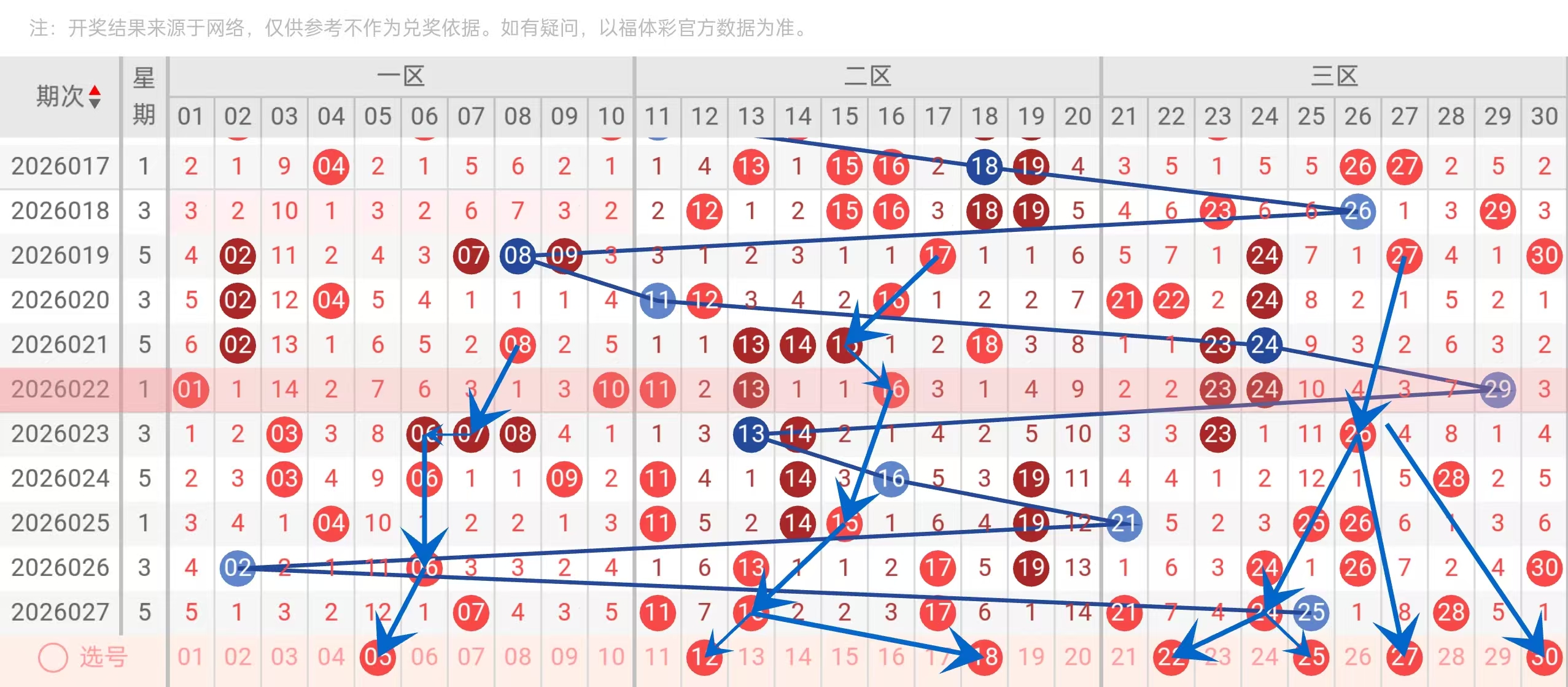将1-30分为三区:一区1-10,二区11-20,三区21-30。2026027期区间比为1:3:3,二区三区均衡,一区冷清。本推荐号码区间比为1:2:4(一区05,二区12、18,三区22、25、27、30)。一区仅选一枚,延续其冷势;二区两枚,保持中等热度;三区四枚,重点布局,因为三区近期持续活跃(如2026027期3枚,2026026期3枚),且历史数据中三区爆发的情况常见(如2026019期三区4枚)。区间分布1:2:4既符合近期趋势,又为可能的一区回补留有余地。