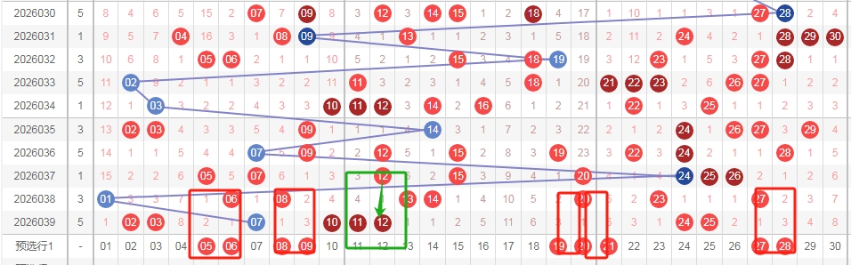 上图是福彩七乐彩开奖号码走势分布图,我标注出来的红色框框看看都是隔一期带连号的图形,因为你们看我标注出来的绿色框框上期出现的连号10 11 12其中数字12是隔一期的,那么按照这样的走势,本期可以按照这样的走势去选择号码,比如关注连号0506是数字06也是隔一期的,还有关注连号0809其中数字08也是隔一期的,还有连号1920 2021 还有连号2728这些都可以留意一下,都是隔一期带出连号的走势。