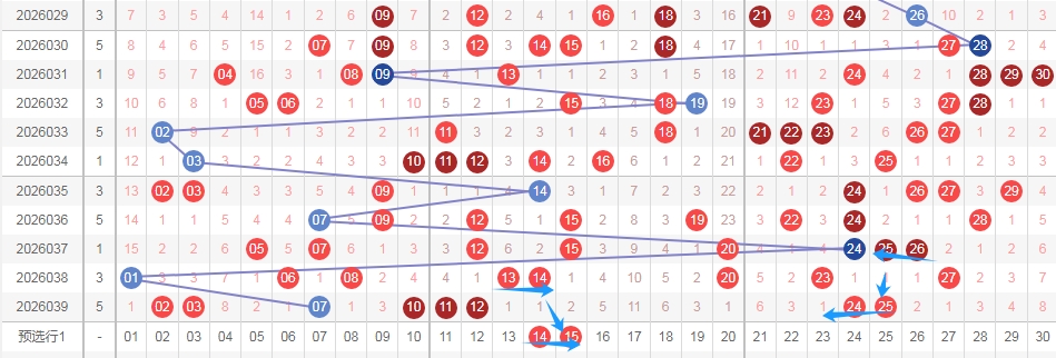 上图是福彩七乐彩开奖号码走势分布图,我标注出来的蓝色小箭头你们看看,上面出现了连号2526隔一期后就出现了连号2425,那么按照这样的走势,我们看看上上期出现了连号1314,本期是不是可以看看连号1415,都是同一种走势。