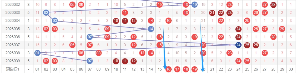上图是福彩七乐彩开奖号码走势分布图,我标注出来的蓝色箭头中间这个区域的数字16 17 18 19已经连续三期没出现号码,最近5期这个区域也只开出了一个数字,那么本期这个区域出号码的机会是有的,关注这个区域的数字出一个或者两个,防出3个吧。