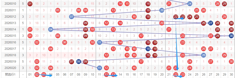上图是福彩七乐彩开奖号码走势分布图其中一部分走势图,号码从数字01到数字10这个区域,你们看看上面走势图中标注出来的蓝色箭头表示的就是连号组合,最近这个区域的连号组合遗漏了6期上次遗漏了2期,这个区域本期或者近期大家可以看看出连号组合一组或者两组,个人最喜欢连号组合0203 0304 0607 0809。