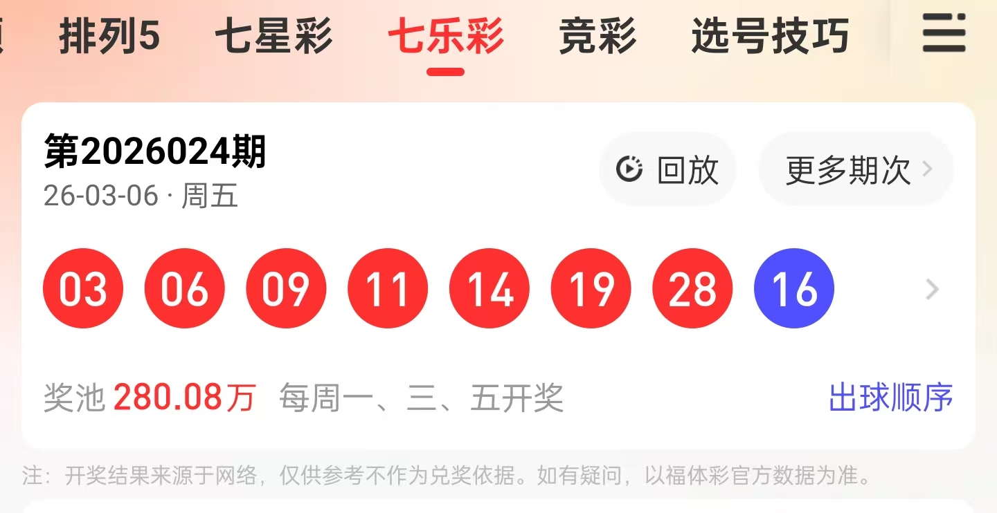 最新一期七乐彩回顾(2026-03-06,期号2026024)