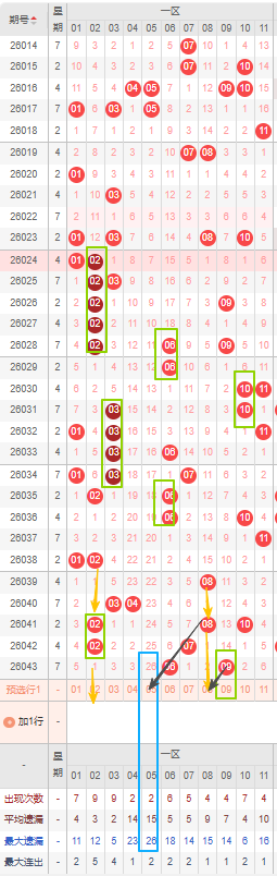 一区本期选号建议首先考虑遗漏期数较大的号,05号都达到了遗漏十期以上且已到达其最大遗漏期数,是目前一区遗漏期数最大的号建议防冷号开出。隔断号可以考虑08号,本期若开出将形成1-2的形态规律,还有02号若开出则形成2-1的形态。
