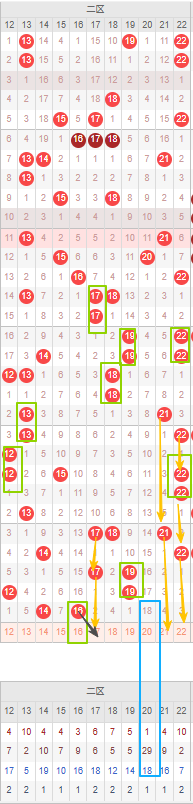 由图可见红球二区目前遗漏达十期以上的冷号可以考虑20号,都遗漏十期以上且达到了最大遗漏期数,可以防冷号开出。可见二区的冷号也只遗漏十余期左右而已,那么因此本期考虑的重点就是重号以及邻号开出。二区来着重看隔断号首先可以考虑17号,若本期开出将形成1-2的形态规律,同时可以本期考虑作为邻号开出。