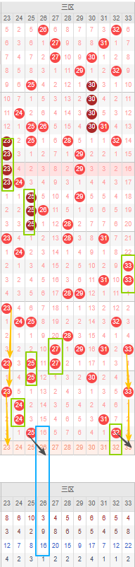 在近20期内开出了重号次数较多,其中23号、25号、30号连续开出了三重号及以上,已经是三区出现的重号连续期数最高的了,可见三区重号几率之高那么本期可以防32号继续开出重号。26号遗漏期数已经有10期以上,且已经达到其本身的最大遗漏期数,可以考虑防冷号开出。三区本期只有一位冷号而且期数不太高,那么本期主要看隔断号,23号若开出则形成3-1-3的形态,33号若开出形成2-3的形态。