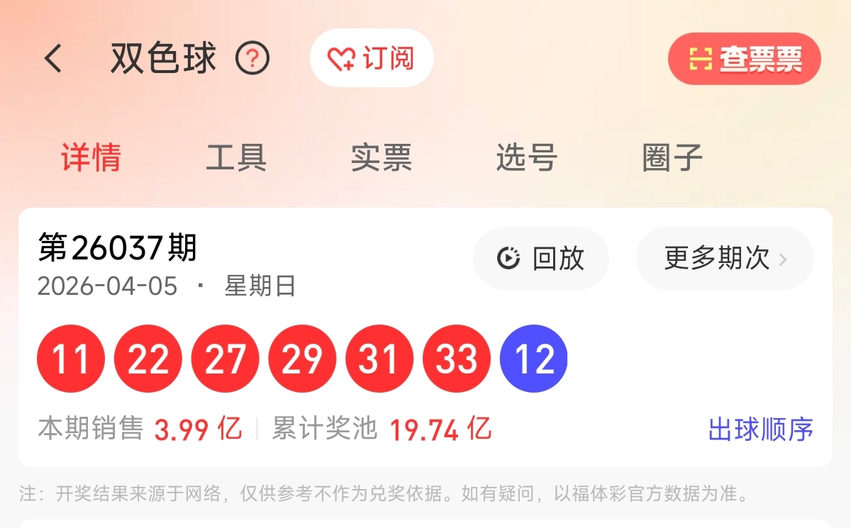 首先让我们回顾一下上期双色球26037期的开奖号码为11、22、27、29、31、33,蓝球12。和值153,跨度22,区间比为1:1:4,奇偶比为5:1。