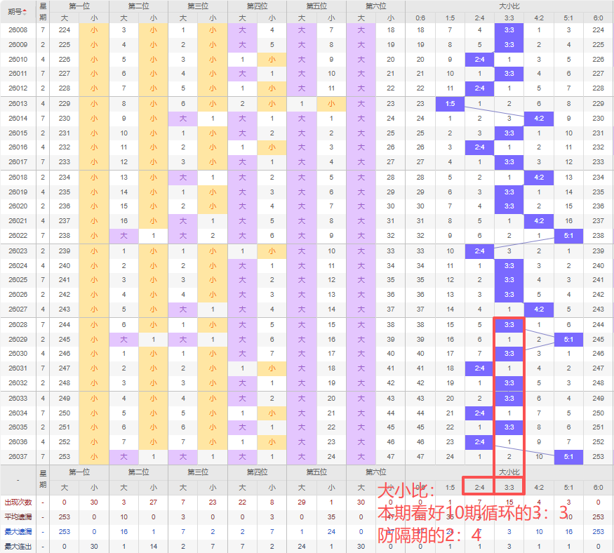 上期大小比:5:1,近10期大小比出现情况:3:3、5:1、3:3、2:4、3:3、3:3、2:4、3:3、2:4、5:1,最近10期出现5期3:3,出现0期4:2,出3期2:4,出现2期5:1,出现0期1:5,出现0期6:0,出现0期0:6,根据近10期规律本期看好遗漏10期循环出3:3,防隔期开的2:4,综上所述推荐大小比推荐:2:4,重点关注:3:3。