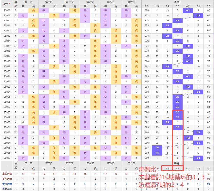 上期奇偶比:4:1,近10期奇偶比出现情况:3:3、3:3、2:4、3:3、5:1、4:2、5:1、1:5、1:5、5:1,最近10期出现3期3:3,出现1期4:2,出现1期2:4,出现3期5:1,出现2期1:5,出现0期6:0,出现0期0:6,根据近10期规律本期看好10期循环的3:3,防遗漏7期的2:4,综上所述推荐奇偶比推荐:2:4,重点关注:3:3。
