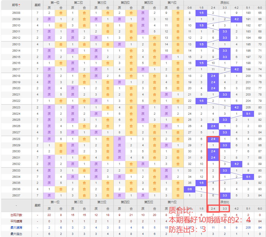 上期质合比:3:3,近10期质合比出现情况:2:4、3:3、2:4、2:4、4:2、3:3、5:1、1:5、0:6、3:3,最近10期出3期3:3,出现1期4:2,出现3期2:4,出现1期5:1,出现1期1:5,出现0期6:0,出现1期0:6,根据近10期规律本期看好10期循环出2:4,防连出3:3,综上所述推荐质合比推荐:3:3,重点关注:2:4。