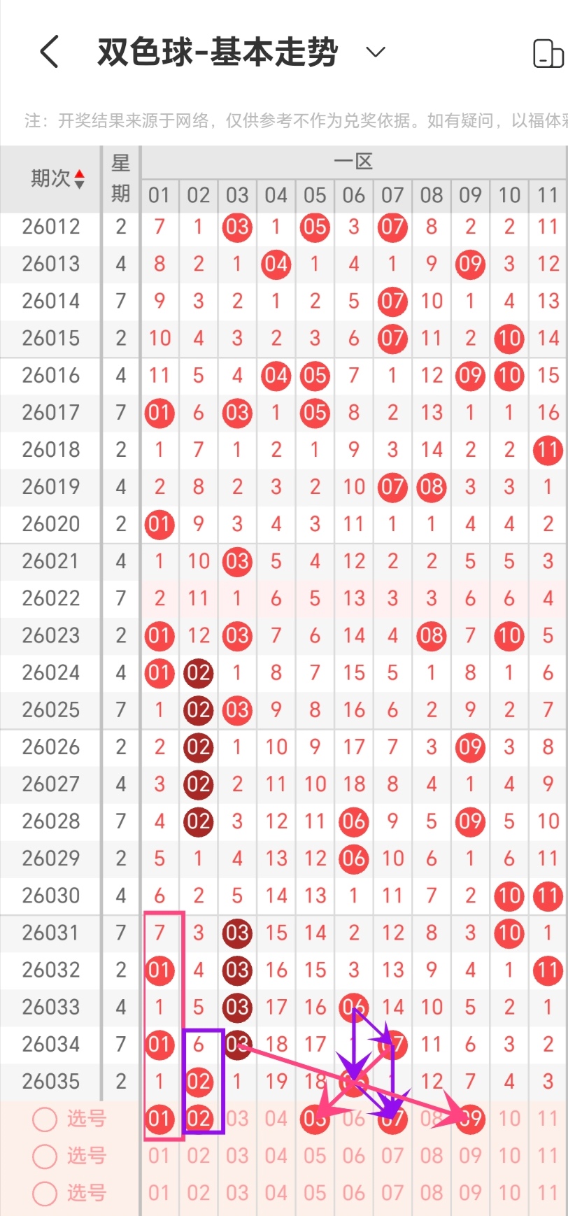 通过对同日期重号出现的数量规律进行统计分析,本期考虑出号0-1个,即02-08-09-12-21-31出号0-1个