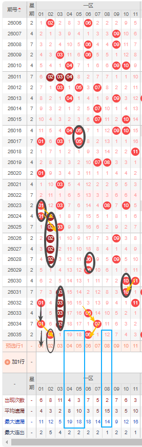 一区本期选号建议首先考虑遗漏期数较大的号,04号、08号都达到了遗漏十期以上且已到达其最大遗漏期数,是目前一区遗漏期数最大的号建议防冷号开出,05号同理,且05号也是上一期开出的06号的邻号。隔断号可以考虑1号,本期若开出将形成1-1的形态规律。