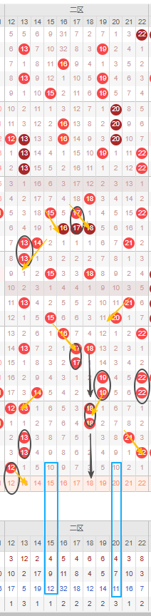 由图可见红球二区目前遗漏达十期以上的冷号可以考虑15号和20号,都遗漏十期以上,可以防冷号开出。那么因此本期考虑的重点就是重号以及邻号开出。二区来着重看邻号,首先考虑13号,若本期开出同时形成上期开出的12号的邻号。其次隔断号可以考虑18号,若本期开出将形成3-3形态规律。