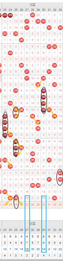 在近20期内开出了重号次数较多,其中23号、25号、30号连续开出了三重号及以上,已经是三区出现的重号连续期数最高的了,可见三区重号几率高,上一期开出的三个号本期更看好重号看好25号继续开出重号。邻号可以考虑上期开出的号码的邻号23号和26号。最后27号和30号都遗漏期数已经有10期以上,且已经达到其本身的最大遗漏期数,可以考虑防冷号开出。