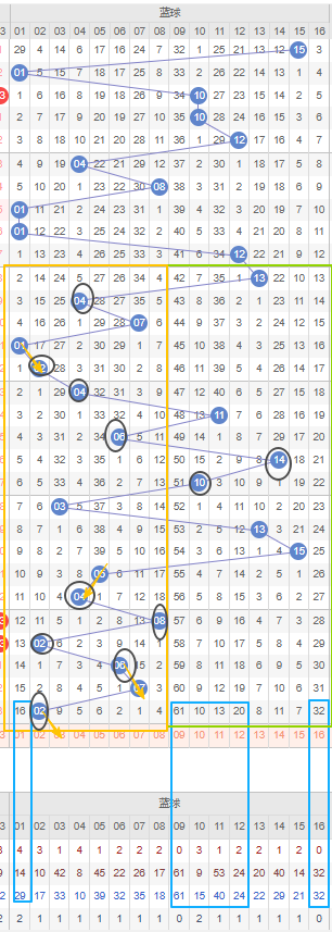 双色球上期蓝号开出一个大号奇数07号,近二十期开出了6期大号和14期小号,之前还连出过五期小号,而近五期内再次都开出的小号,那么本期开出大号的概率较大。如图所示蓝区的遗漏期数大的冷号很多,可以考虑遗漏期数较大的大号,比如09号、12号、16号,建议都防冷号开出。09号是蓝区遗漏期数最大的开出的可能性非常之大,可以防冷号开出。遗漏期数较大的10号和11号也可以考虑防冷号开出。其次可以考虑03号作为邻号开出。