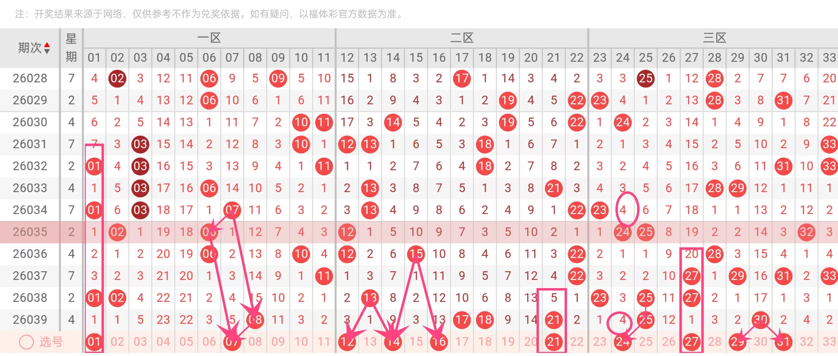 小号(01-16):01、07、12、14、16(5个);大号(17-33):21、24、27、29、31(5个)。完美5:5,利于组合出3:3或4:2的单注,符合近10期大小比走势(3:3出现4次,4:2出现3次,2:4出现3次)。