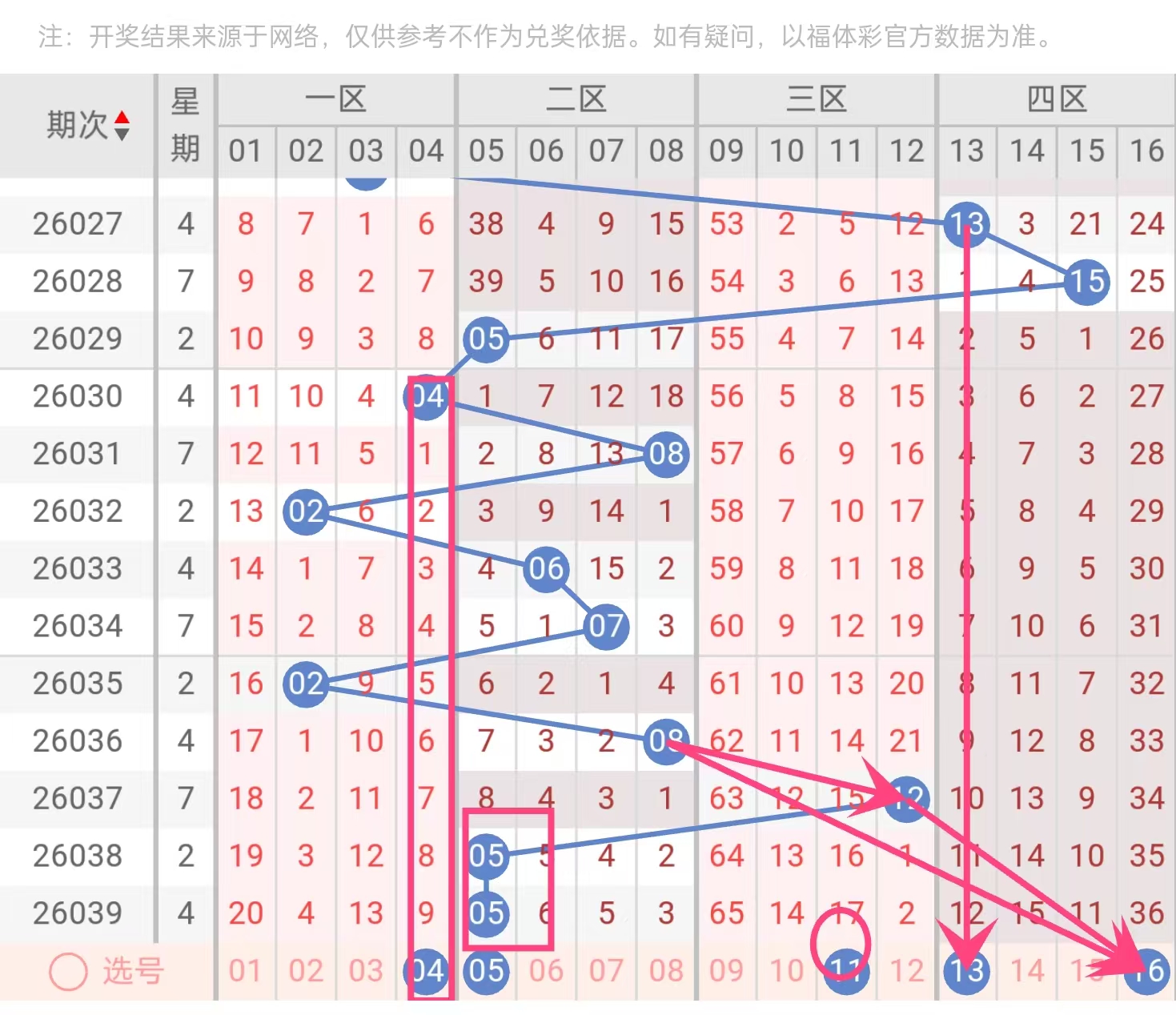 近10期蓝球奇偶比4:6,偶略多,但上期为偶,本期可奇可偶。本组推荐04偶、05奇、11奇、13奇、16偶,奇偶3:2。大小(以09为界):小号04、05;大号11、13、16,大小2:3,均衡。