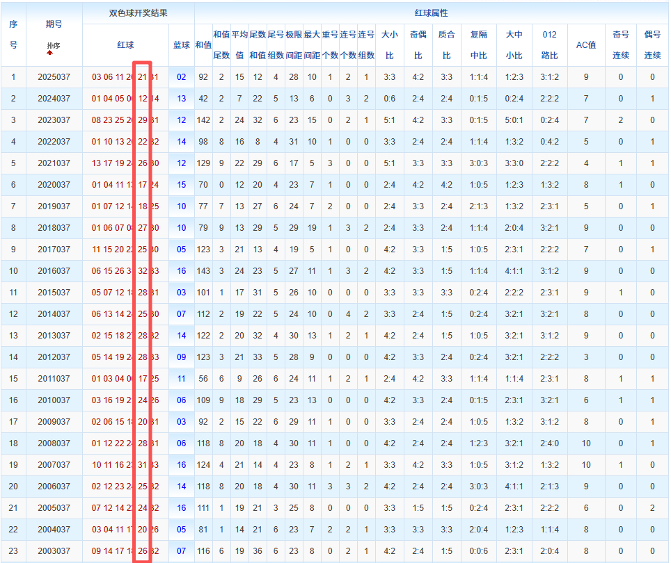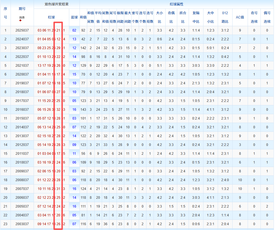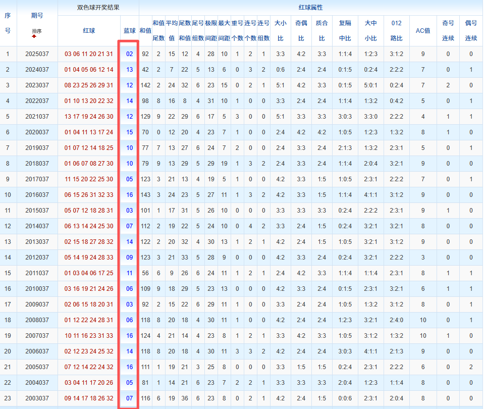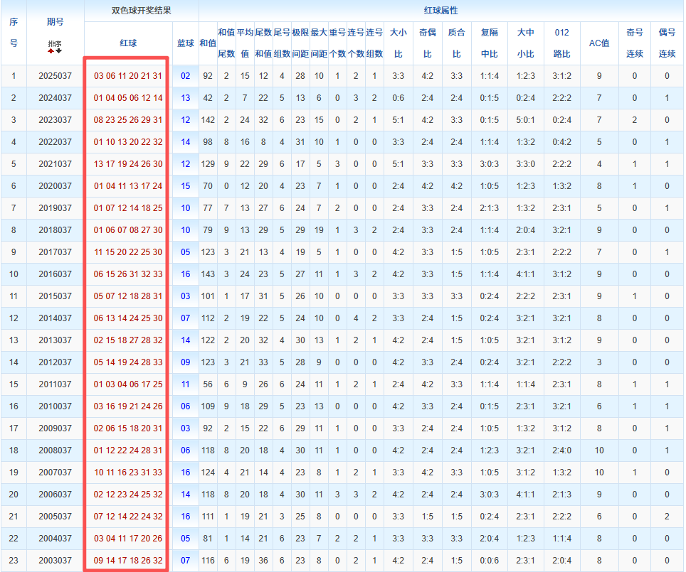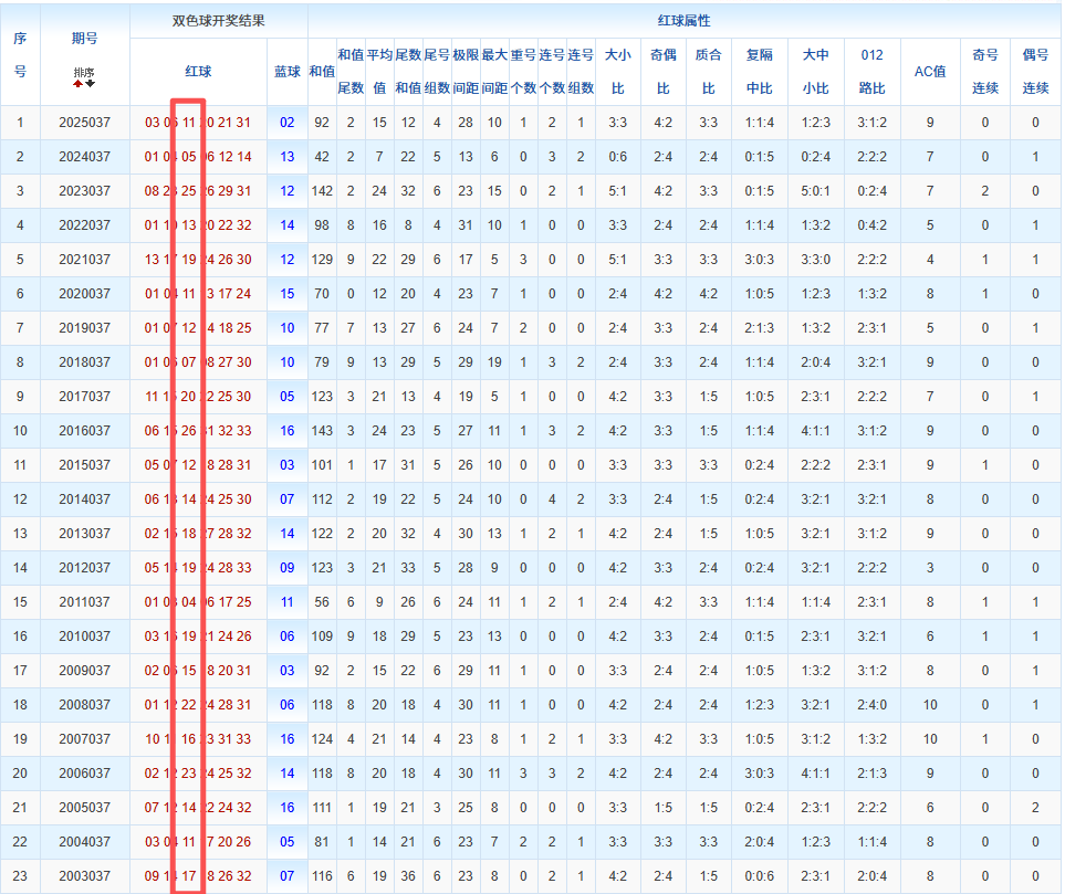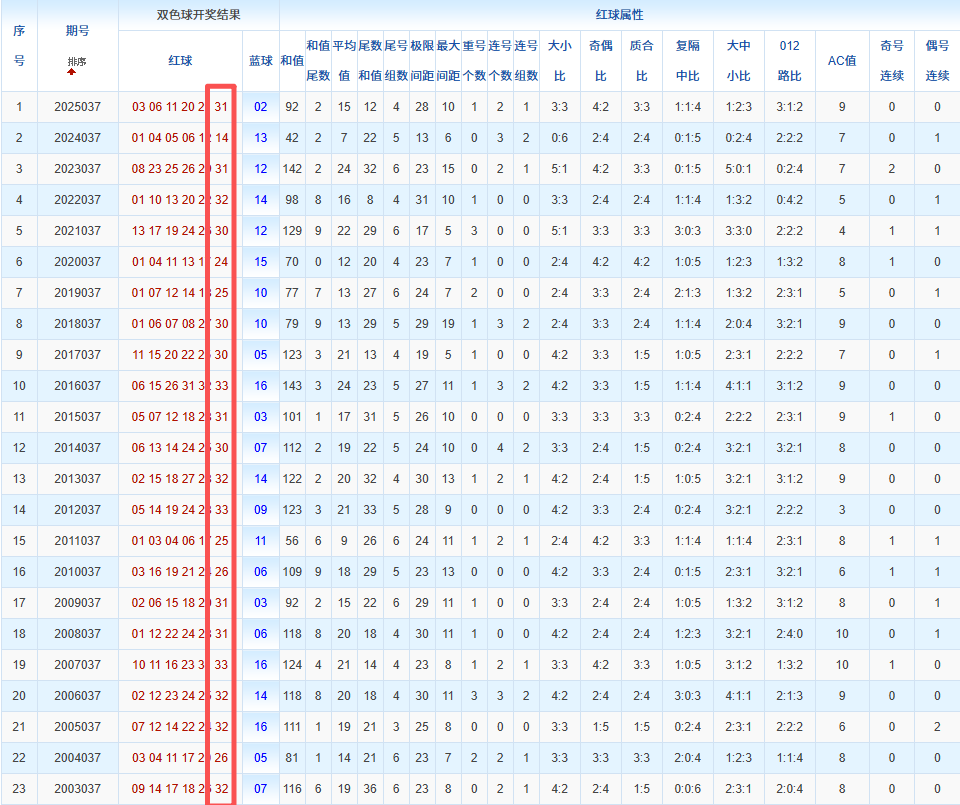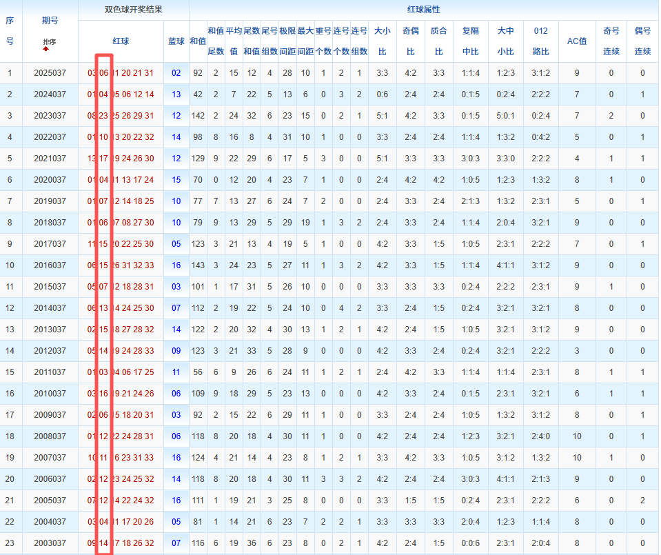 通过观察,我发现双色球往年同期的开奖数据与本期号码之间存在显著关联。具体来说,在红球中,从第一位至第六位,通常会有约4个位置上的数字与往年同期相同位置的号码一致;而蓝球号码中,也有多期开奖结果直接包含了往年同期的数字。因此,我们可以借助往年同期各位置上的号码,作为分析本期开奖情况的重要依据。在此基础上,还可结合往年同期的其他相关条件,进行综合性的号码组合推荐。