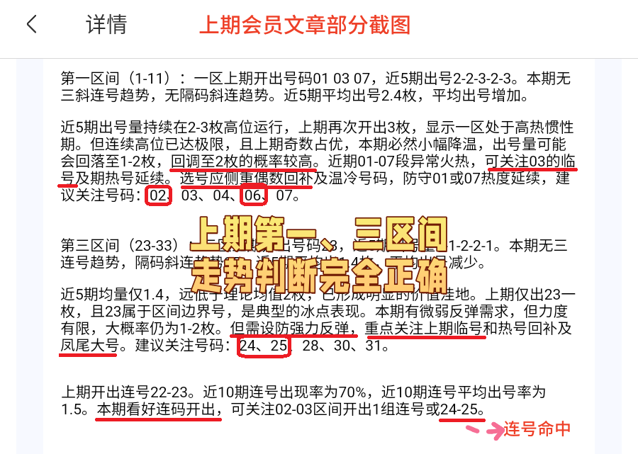 会员文章中双胆对1,龙头命中,连号命中。