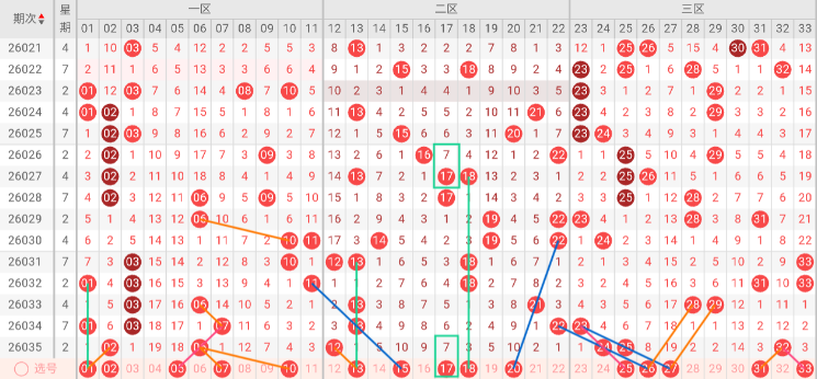 呈现低位震荡后强势拉升的特征。上期开出3码,创下近期新高。该区热度正在回升,但连续高开后通常会有小幅回调。本期出号量可能将回落至2码,但需防小幅收敛。建议关注号码:25、26、27、31、33。