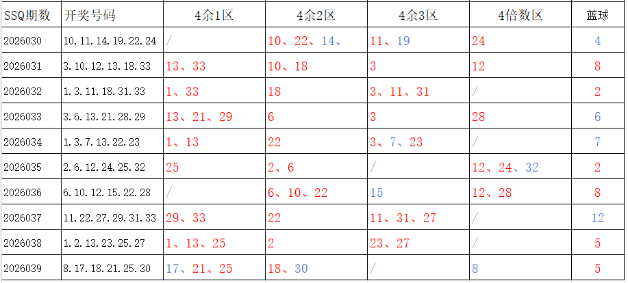 分享第一个数据分析:四分区统计数据。相对于传统的三分区,个人习惯使用四分区,就是把33个红球号码除以4,所得的余数分区如下: