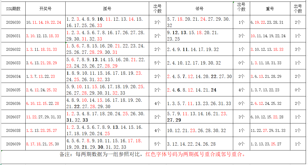 如图,以近两期数据为一组,进行对比分析。相同的孤号、邻号,可能在下期出1-4个左右。上期开出孤号5个,邻号0个,重号1个。本期参考孤号:1.2.3.4.5.6.10.11.12.13.14.15.23.27.28.32.33;邻号:7.9.16.19.20.22.24.26.29.31;孤、邻号重合号码精选:***(会员专区可见)。个人分析,仅供参考。