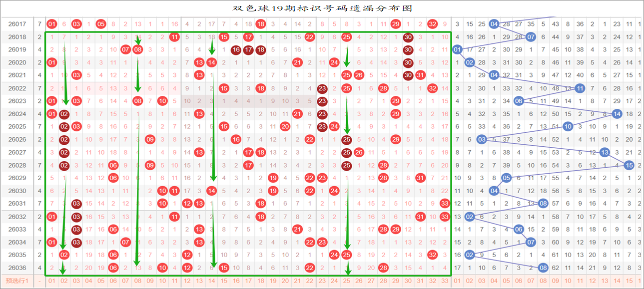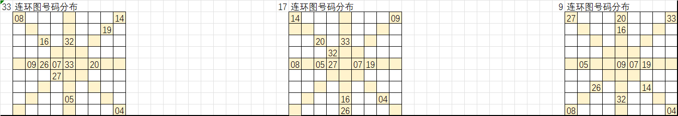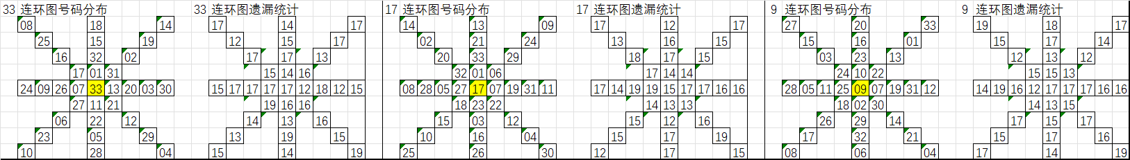 由于数据量大,不一一统计,下图为各个号码分别在33、17、9连环图上的遗漏统计汇总图: