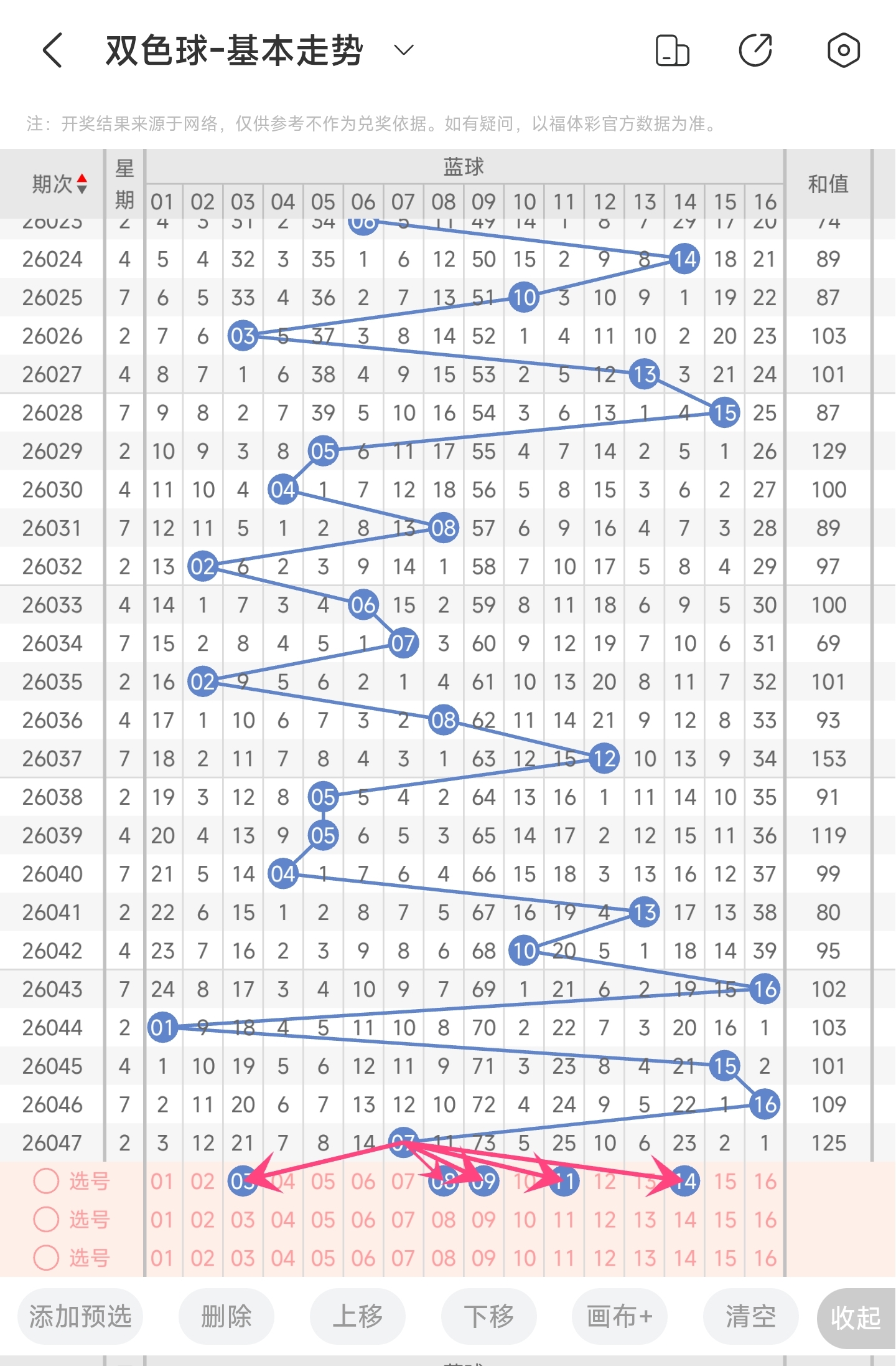 上期开出的是7,往前一期开出的是16。趋势往左移动,偏移量为9。通过分析目前蓝球的走势图,目前趋势是可能往左也可能往右。从偏移量看,近期蓝球偏移量变化比较频繁,时大时小,本期防一下突然变小的可能,关注中间的号码。最后再结合遗漏期数,以及冷热号,本期我们可以关注1,8,9,11,14等号码。