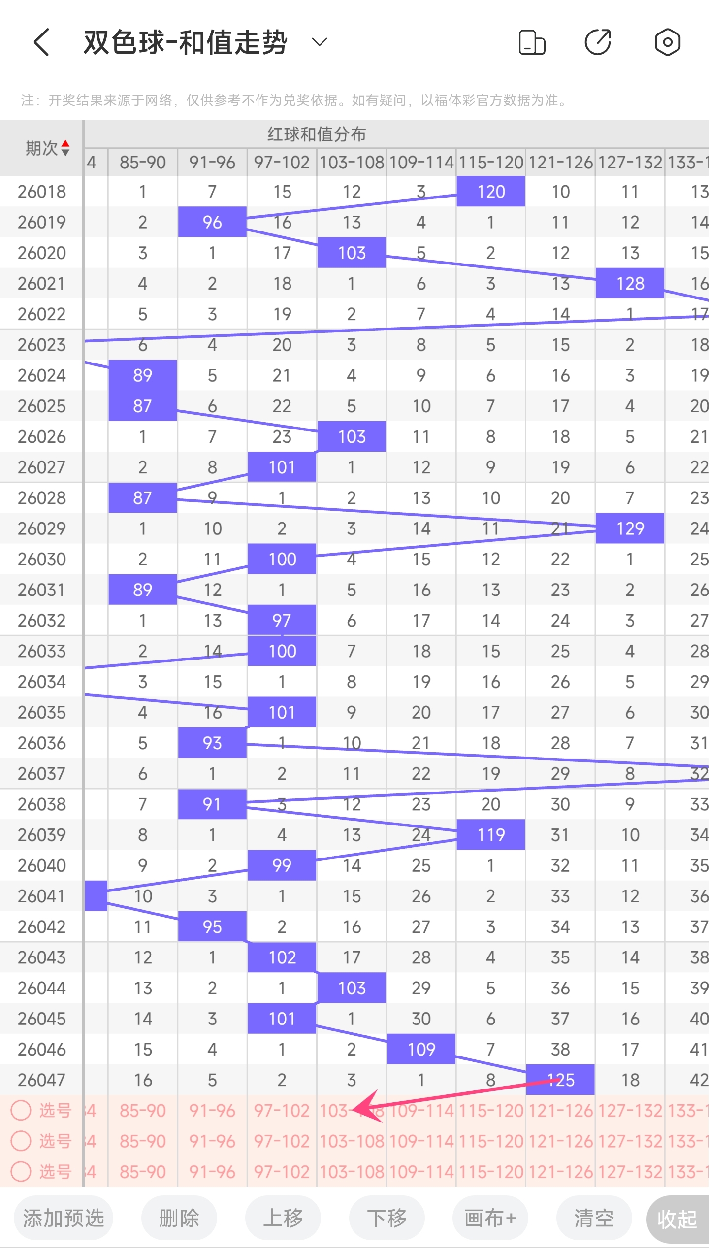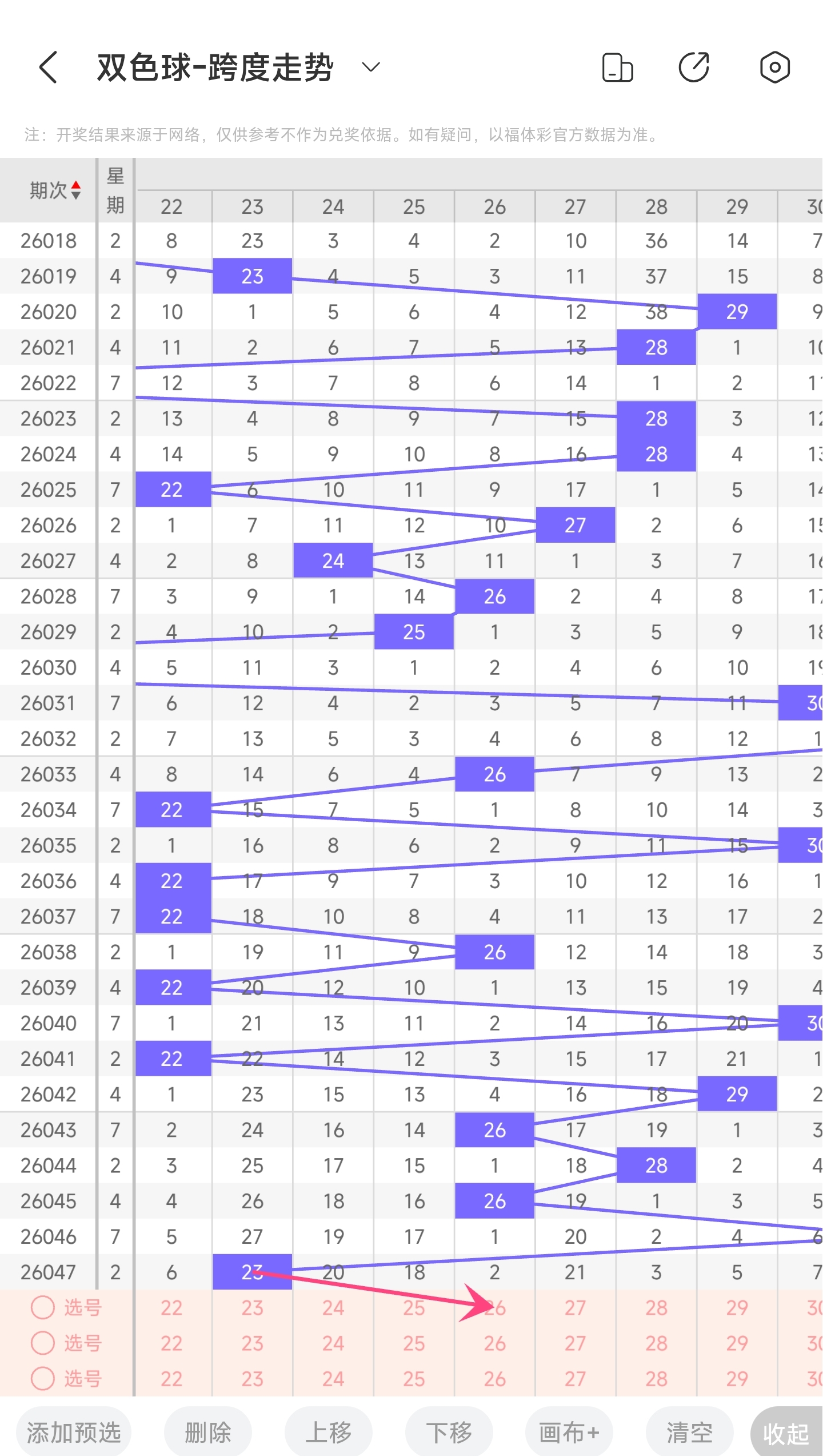 上期龙头为7,凤尾为30,跨度为23,往前一期跨度是31,偏移量为8。26跨度值是30期内开出很小的跨度值。下降的空间比较小,上升空间很大,根据最近龙头凤尾走势,推测本期跨度可能会变大,所以推测本期跨度趋势是往右的,跨度变大,小概率跨度变小。