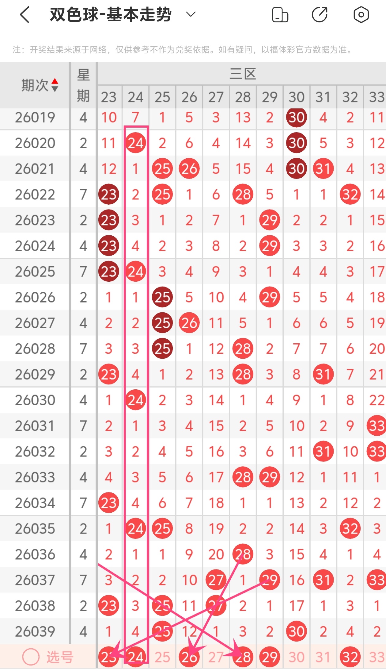 上期第三区间开出25 30,本期我们可以从上面走势图中看到选号的思路,6码推荐:23, 24, 26, 28, 29, 32