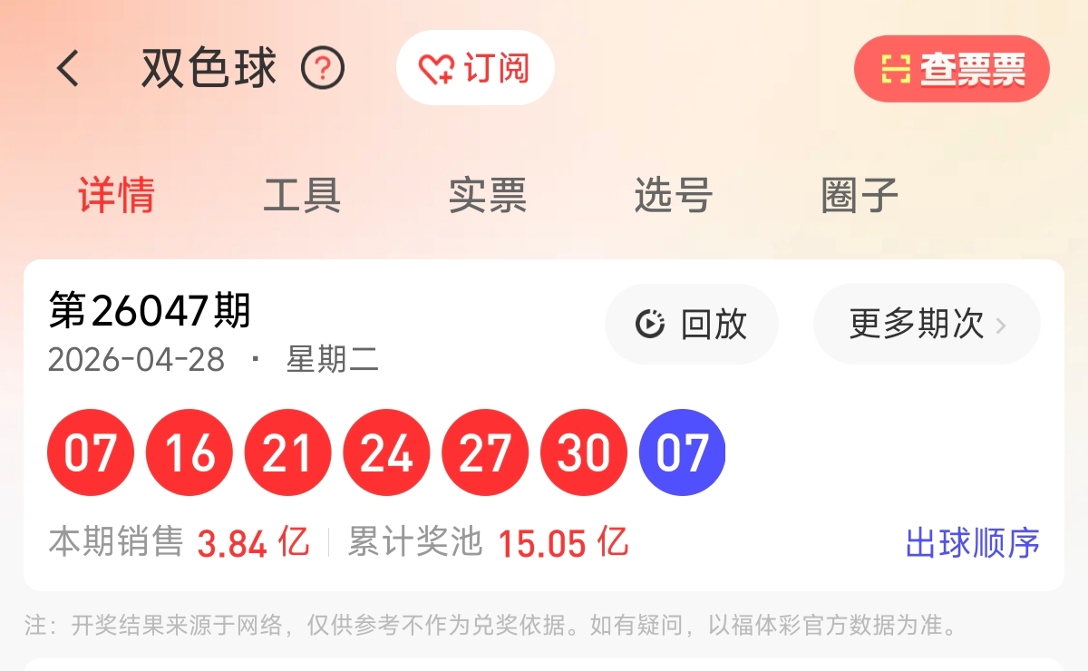 首先让我们回顾一下上期双色球26047期的开奖号码为07、16、21、24、27、30,蓝球07。和值125,跨度23,区间比为1:2:3,奇偶比为3:3。