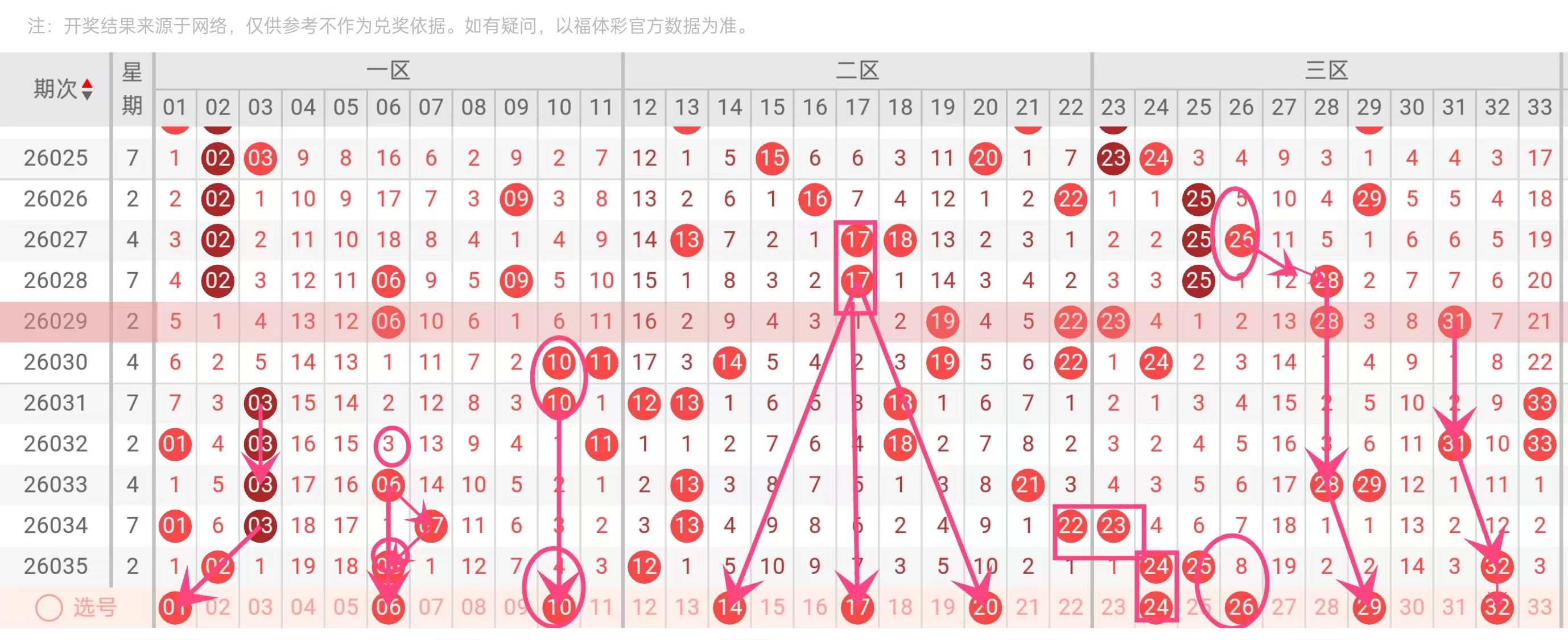 一区(01-11):选01、06、10,兼顾边号(01)与中段(06、10);二区(12-22):选14、17、20,形成14-17跳号、17-20斜连;三区(23-33):选24、26、29、32,其中24和26为偶连,29为上期重号,32为大尾冷号(近30期出现3次,遗漏5期)。
