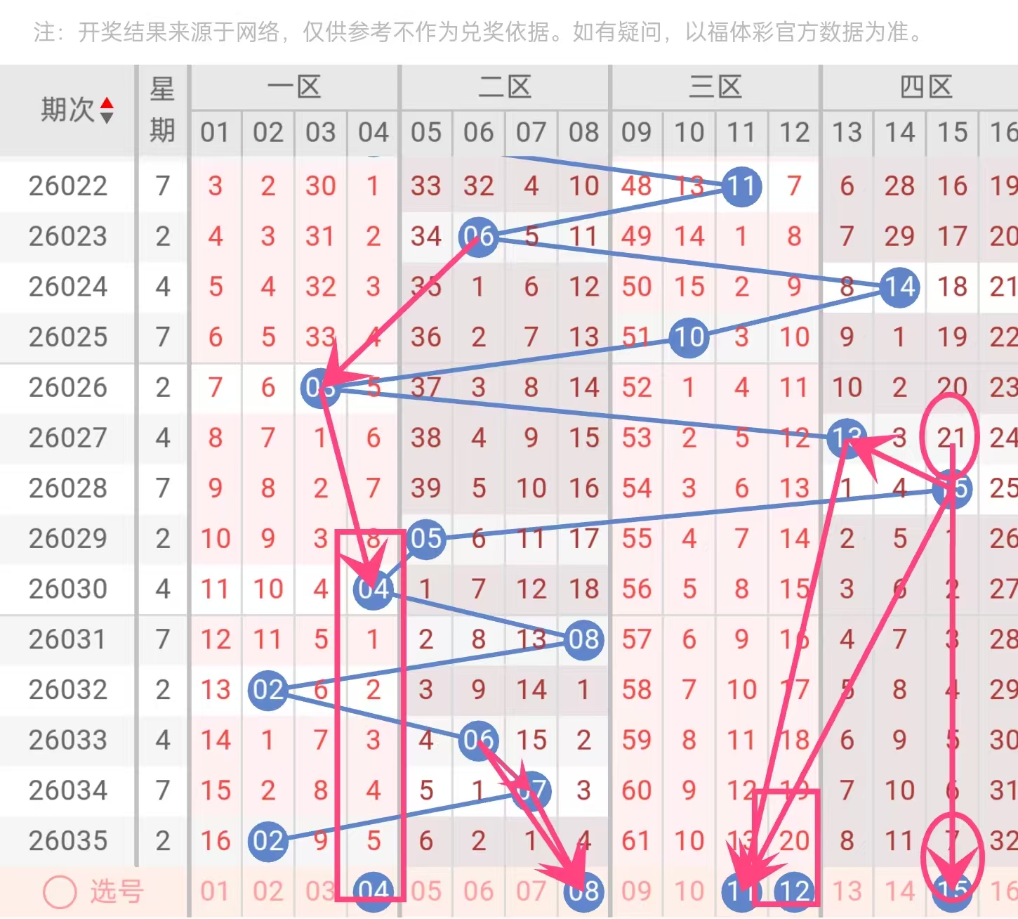 蓝球尾数近期以0、2、3、4、5、6、8为主,缺少1、7、9尾。本方案中04(尾4)、08(尾8)、11(尾1)、12(尾2)、15(尾5),补全了尾1,同时保留温热尾数。
