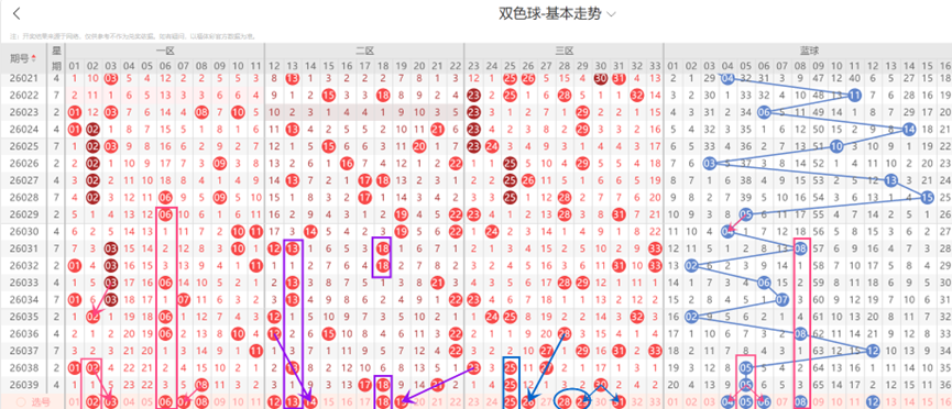 二区上期开出了3个号码,本期二区大概率不会断区,本期二区出号数量可以考虑1-2个;本期二区需要关注的号码;12-13可能会一起落号;14与12-13形成了斜连走势;18可能会重出;19与21-23形成了斜连走势;因此本期二区看好12-13-14-18-19等号码。