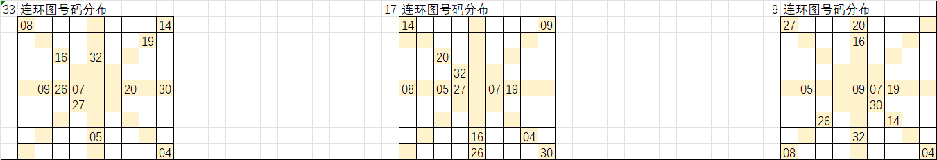 以上是遗漏大于16的号码分别在33、17、9连环图的分布,按照九转连环图选号规律,选取这些号码“环上”和“轴上”的相邻号码作为胆码,把这些胆码进行次数统计即可形成我们组号的排序,从出次多到少进行取号得出我们的大底。