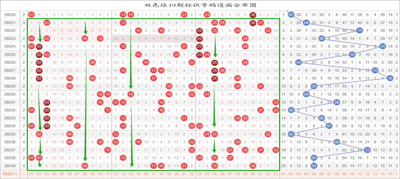 由于数据量大,不一一统计,下图为各个号码分别在33、17、9连环图上的遗漏统计汇总图: