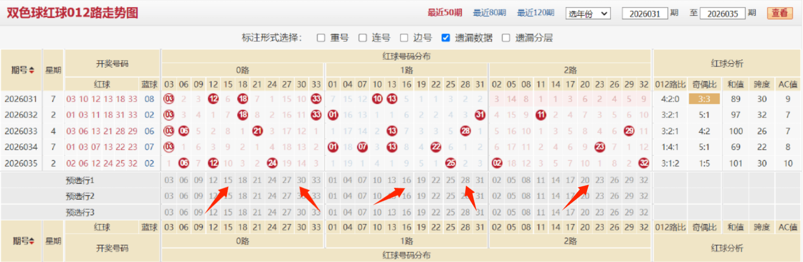 最后在本期的路数比例的回补考虑上,上期012路比例为3:1:2,其中一路号码仅开出1枚(06),处于明显的弱势状态。从路数周期规律来看,一路号码的冷态不会持续太久,本期存在较强的回补需求。预计本期一路号码的出号数量将有所增加,路数比例可能调整为2:2:2或2:3:1,重点关注一区的01、04,二区的13、16,三区的25、28等一路号码,这些号码在近期路数分布中表现相对沉寂,具备较高的回补潜力,可作为本期路数回补策略中的关键参考对象。