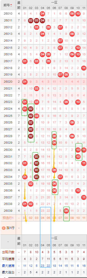 一区本期选号建议首先考虑遗漏期数较大的号,04号、05号都达到了遗漏十期以上且已到达其最大遗漏期数,是目前一区遗漏期数最大的几个号建议防冷号开出。隔断号可以考虑1号,本期若开出将形成1-2-1的形态规律,还有06号若开出则形成3-1-3的形态。