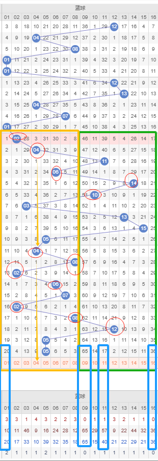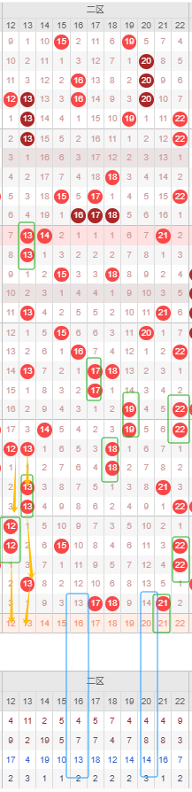 由图可见红球二区目前遗漏达十期以上的冷号可以考虑16号和20号,都遗漏十期以上,可以防冷号开出。可见二区的冷号也只遗漏十期左右而已,那么因此本期考虑的重点就是重号以及邻号开出。二区来着重看隔断号首先可以考虑12号,若本期开出将形成3-3的形态规律。13号若开出形成1-3-1的形态。