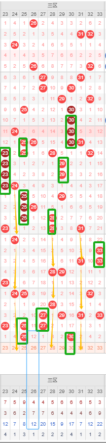 在近20期内开出了重号次数较多,其中23号、25号、30号连续开出了三重号及以上,已经是三区出现的重号连续期数最高的了,可见三区重号几率高上一期的25号已经是重号开出了,那么本期看好看好30号继续开出重号。本期主要看隔断号,24号若开出则形成4-4-4的形态,28号若开出形成3-2-3的形态。最后26号遗漏期数已经有10期以上,且已经达到其本身的最大遗漏期数,可以考虑防冷号开出。