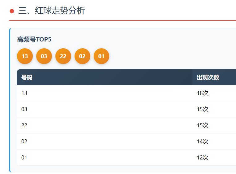 从近50期的整体表现来看,红球的活跃阵营相对集中。13、03、22、02、01这些号码,出现频率明显偏高,几乎是这段时间里的“主力轮换”。尤其是13,出现次数已经达到18次,节奏非常稳定,像一个不太容易被忽视的存在。03和22也紧随其后,保持着较强的参与感。相比之下,04、05、27这些号码,则明显处于“低温区”,遗漏期数较长,有一定的回补需求,但节奏始终没有被真正点燃。