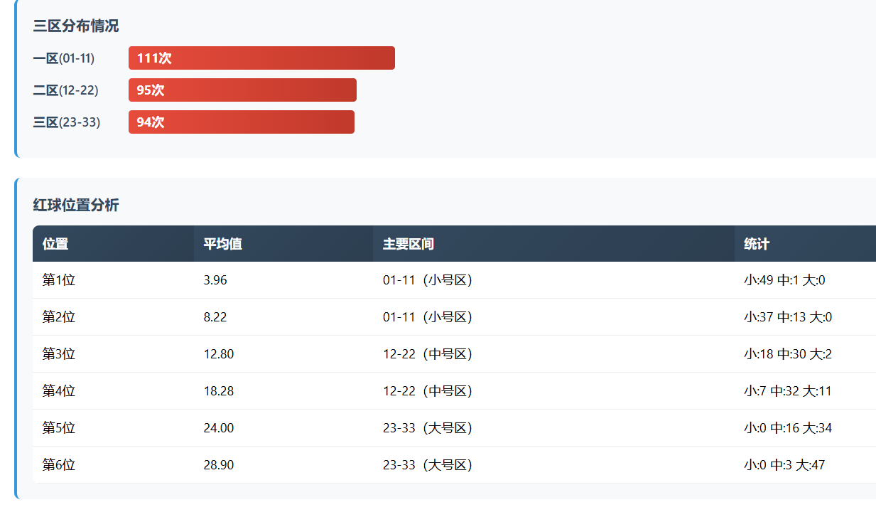 再说红球的分布情况。一区(01-11)整体偏热,出号次数明显领先,说明小号区域近期活跃度较高;二区(12-22)和三区(23-33)相对均衡,但略显收敛。从位置来看,第1位和第2位基本锁定在小号区,稳定性很强;第3位和第4位主要集中在中号区,是一个过渡区域;而第5位和第6位,则几乎是大号的“固定舞台”,尤其是第6位,大号占比极高,节奏非常清晰。
