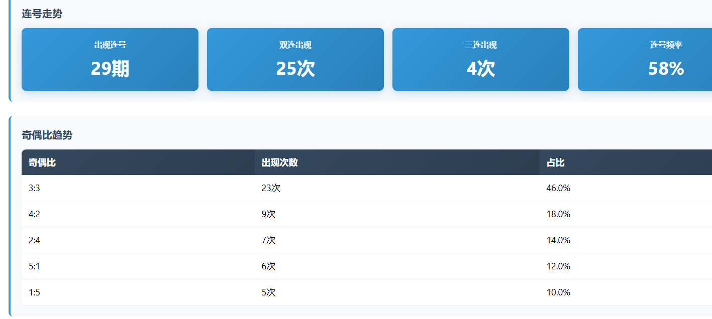 连号方面,整体出现频率在58%左右,属于偏活跃状态。尤其是双连,出现次数不少。但上期偏偏没有连号,这种“突然收紧”,往往意味着后面有重新释放的可能。就像弹簧被压了一下,下一次可能会弹得更明显。所以接下来,适当留意连号回归,是一个比较自然的方向。