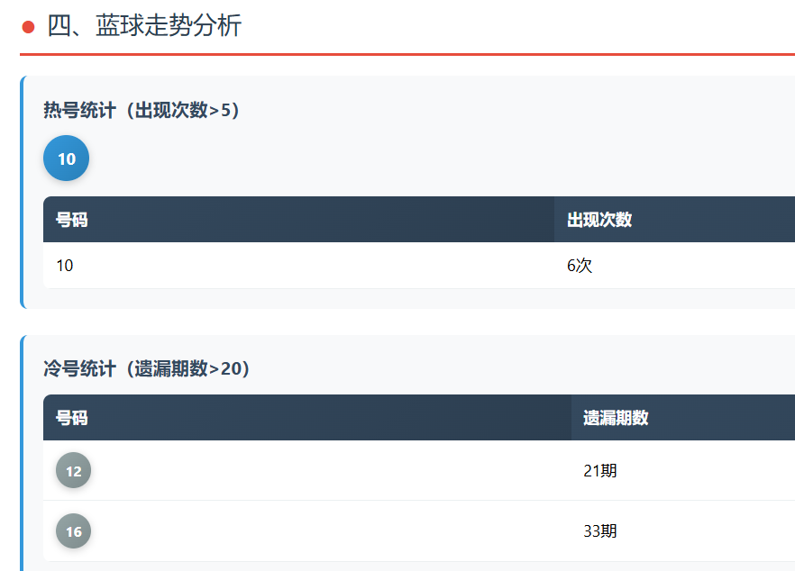蓝球这边,节奏就简单不少。10是当前最活跃的号码之一,表现稳定;而12、16这类长期未出的号码,已经积累了一定的“存在感压力”。不过蓝球的变化往往更灵活,有时候越是沉寂的号码,越容易突然出现,这一点还是要心里有数。