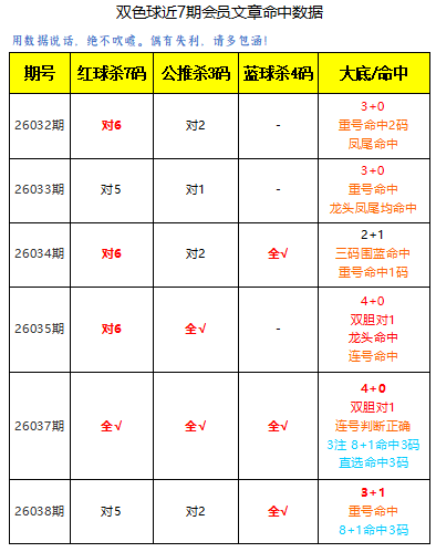 上期红球杀7码对5,公推杀3码对2,蓝球杀号全对。