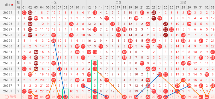 第三区间(23-33):三区上期开出号码23 25 27,近5期出号量1-3-1-4-3。本期三连号趋势24,隔码斜连趋势25。近5期平均出2.4枚,平均出号增加。