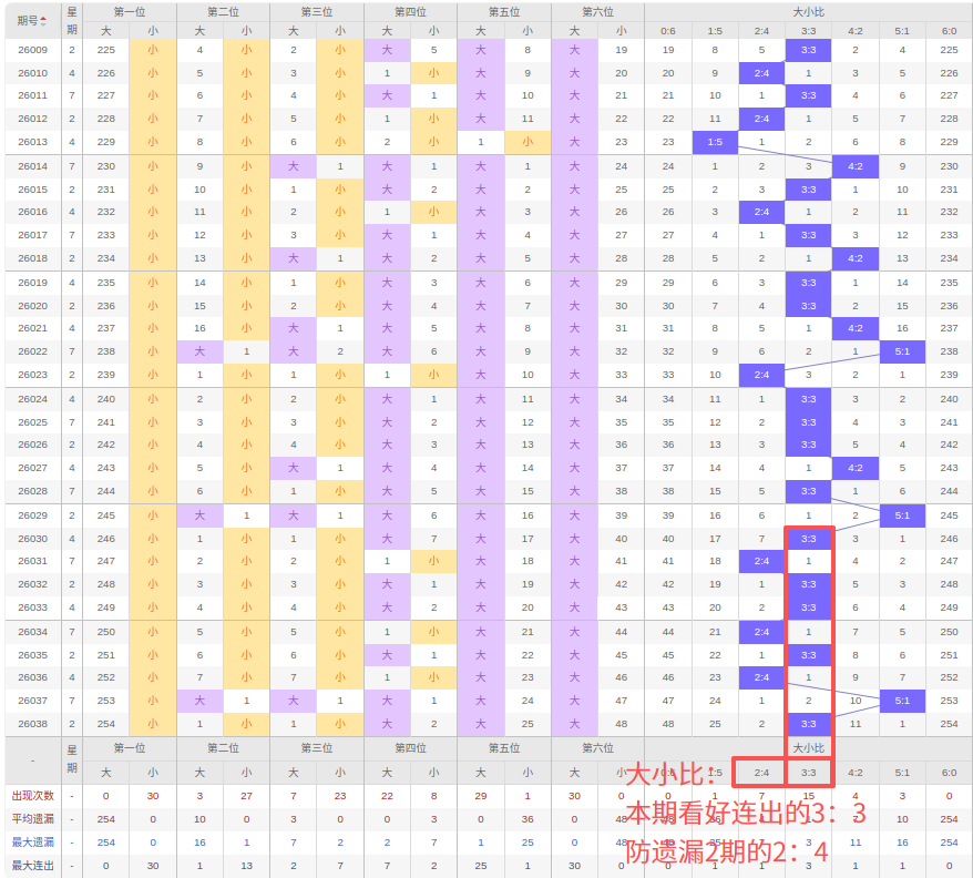 上期大小比:3:3,近10期大小比出现情况:5:1、3:3、2:4、3:3、3:3、2:4、3:3、2:4、5:1、3:3,最近10期出现5期3:3,出现0期4:2,出3期2:4,出现2期5:1,出现0期1:5,出现0期6:0,出现0期0:6,根据近10期规律本期看好连出3:3,防遗漏2期的2:4,综上所述推荐大小比推荐:2:4,重点关注:3:3。