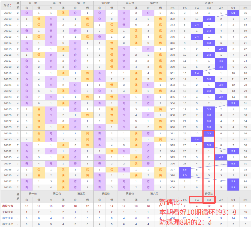 上期奇偶比:5:1,近10期奇偶比出现情况:3:3、2:4、3:3、5:1、4:2、5:1、1:5、1:5、5:1、5:1,最近10期出现2期3:3,出现1期4:2,出现1期2:4,出现4期5:1,出现2期1:5,出现0期6:0,出现0期0:6,根据近10期规律本期看好10期循环的3:3,防遗漏8期的2:4,综上所述推荐奇偶比推荐:2:4,重点关注:3:3。
